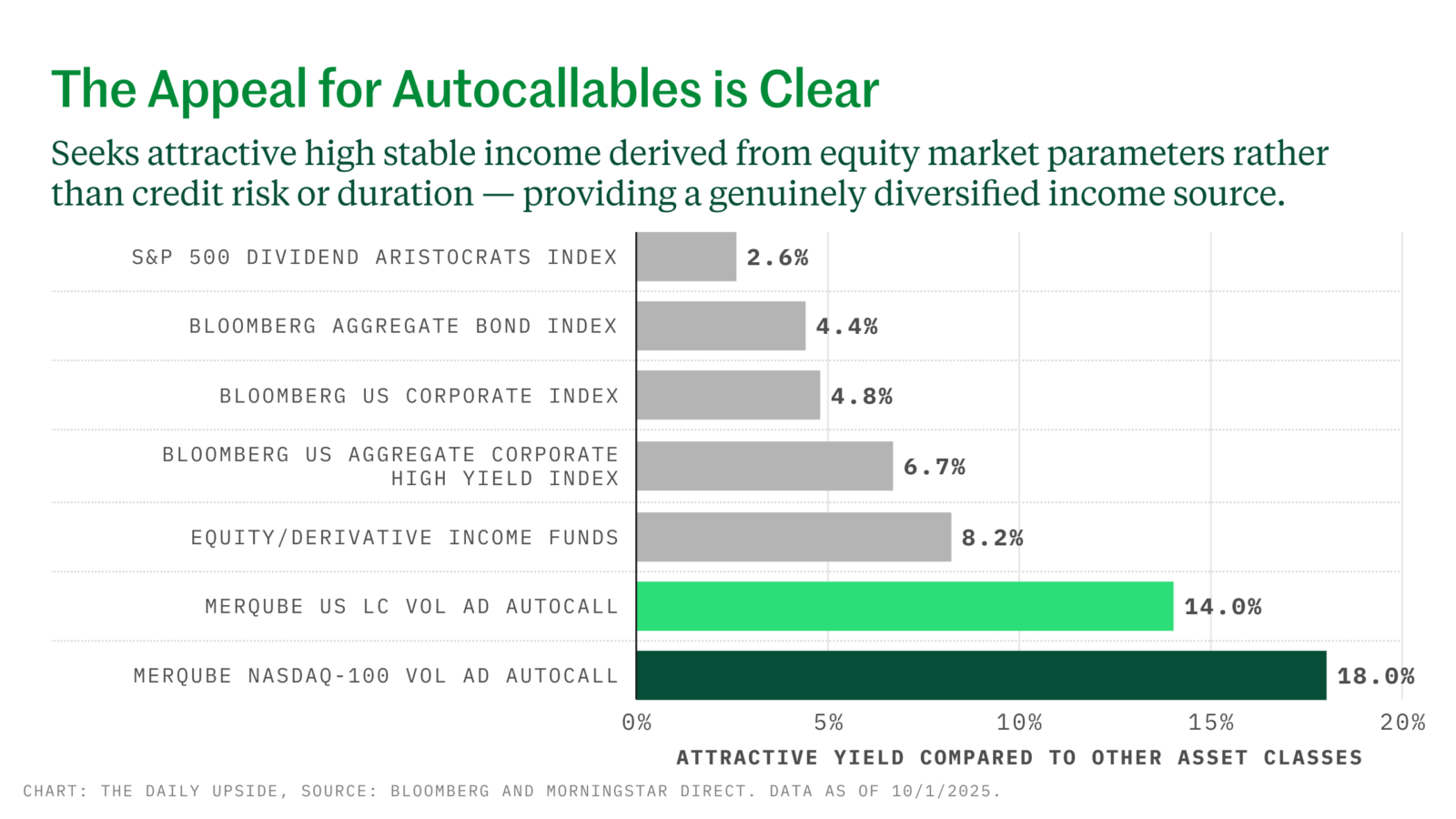 Quality Yield Can Be Elusive. The S&P 500 dividend aristocrat index offers a whopping 2.6%. The Bloomberg US Aggregate Corporate Bond Index? A relatively meaty 6.7%. Structured products can offer the potential for much more. Calamos Autocallable Income ETFs most recent distributions (December 30) offered yields of 14% and 18%. Learn more about the mechanics of autocallables from a $45 billion behemoth.