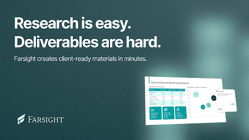 Farsight is the only AI built to deliver client-ready financial work, not summaries you still have to turn into something useful. While other tools help you research, Farsight executes the entire workflow. Built by ex-bankers and investors, it matches your firm’s design, formatting and voice so outputs look like your team’s best work, not generic AI.
